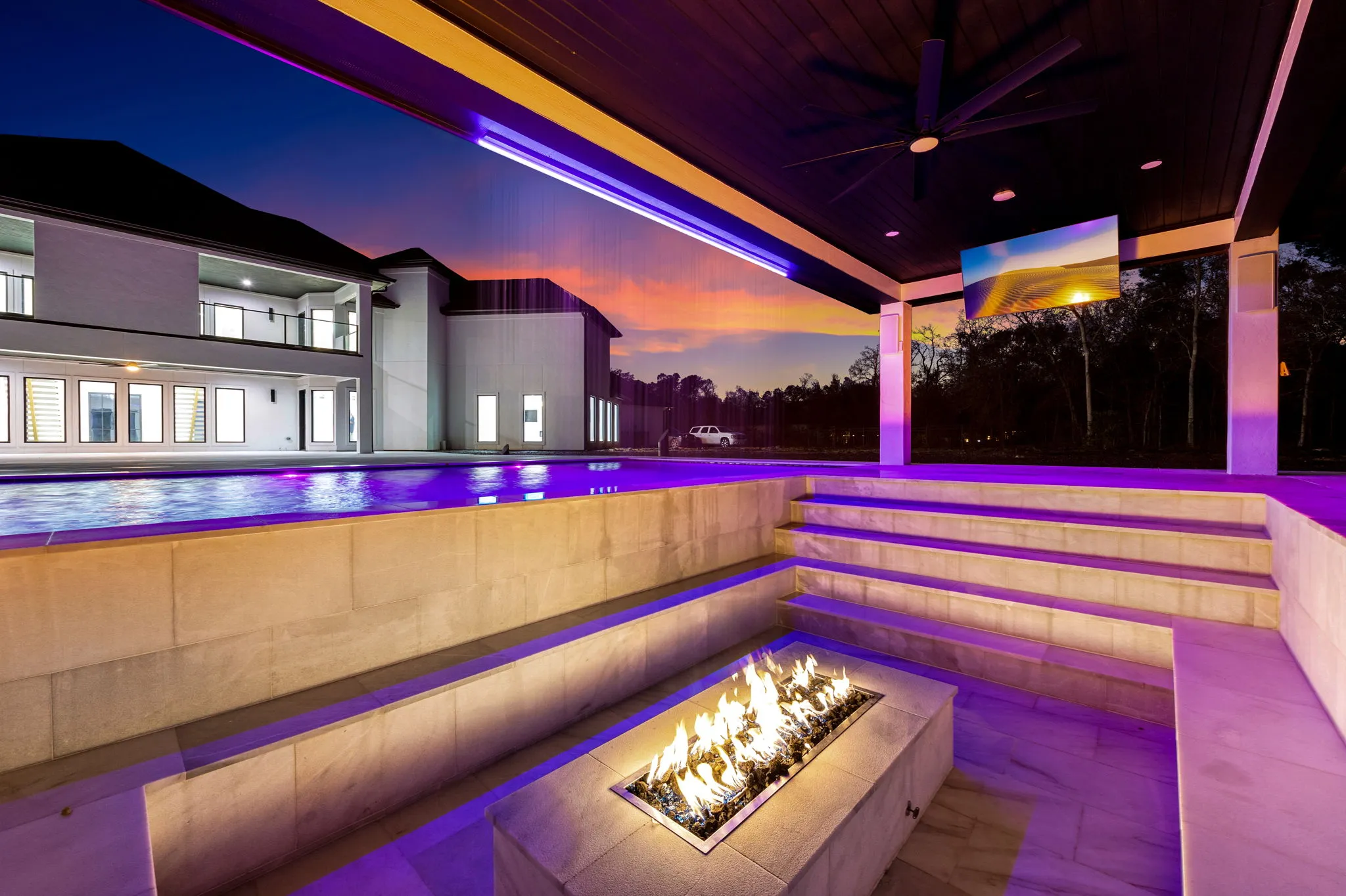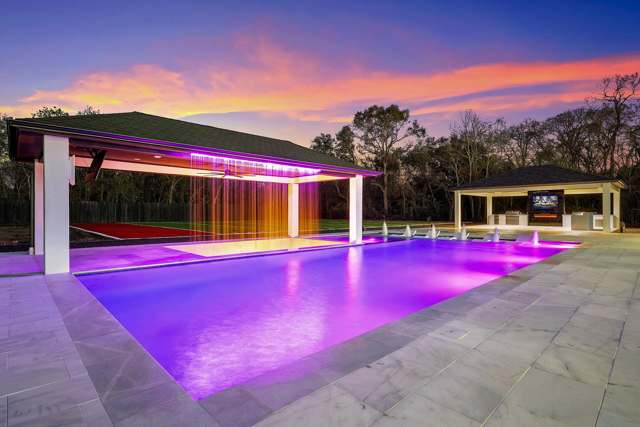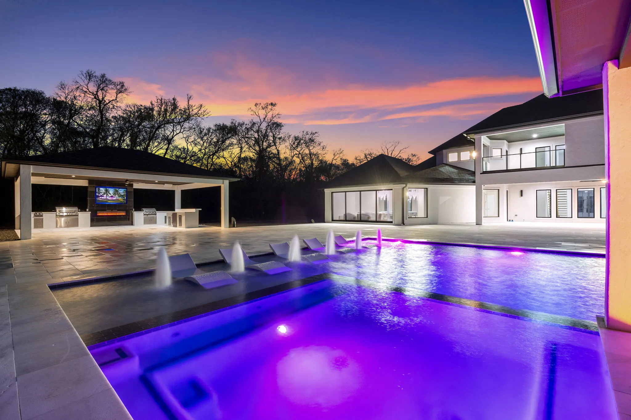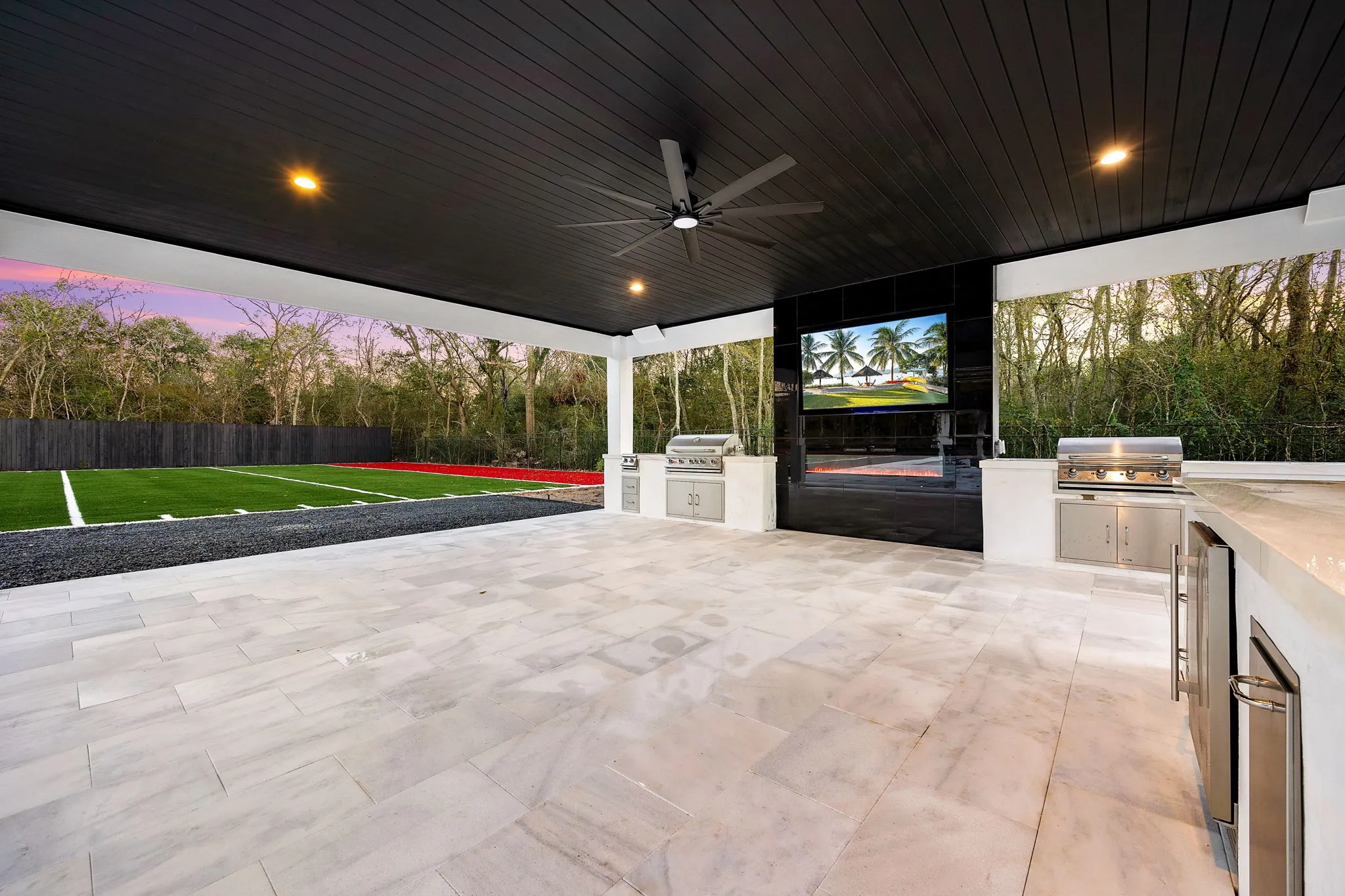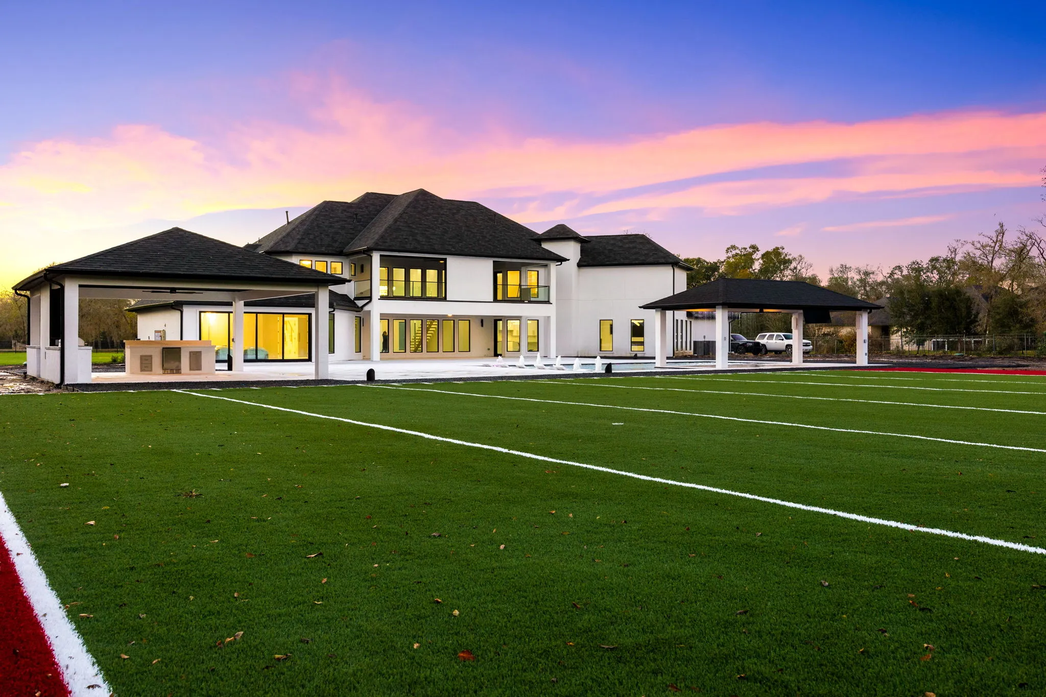 This architectural masterpiece also offers double entertainment rooms, five lavish bedrooms, and six opulent baths, creating a sanctuary for relaxation and social gatherings. But the extravagance doesn't stop indoors; the outdoor space is a dream come true, featuring a private football field, a gourmet outdoor kitchen, and a resort-style pool complete with a Jacuzzi and a fire pit, all surrounded by lush, professionally landscaped grounds.