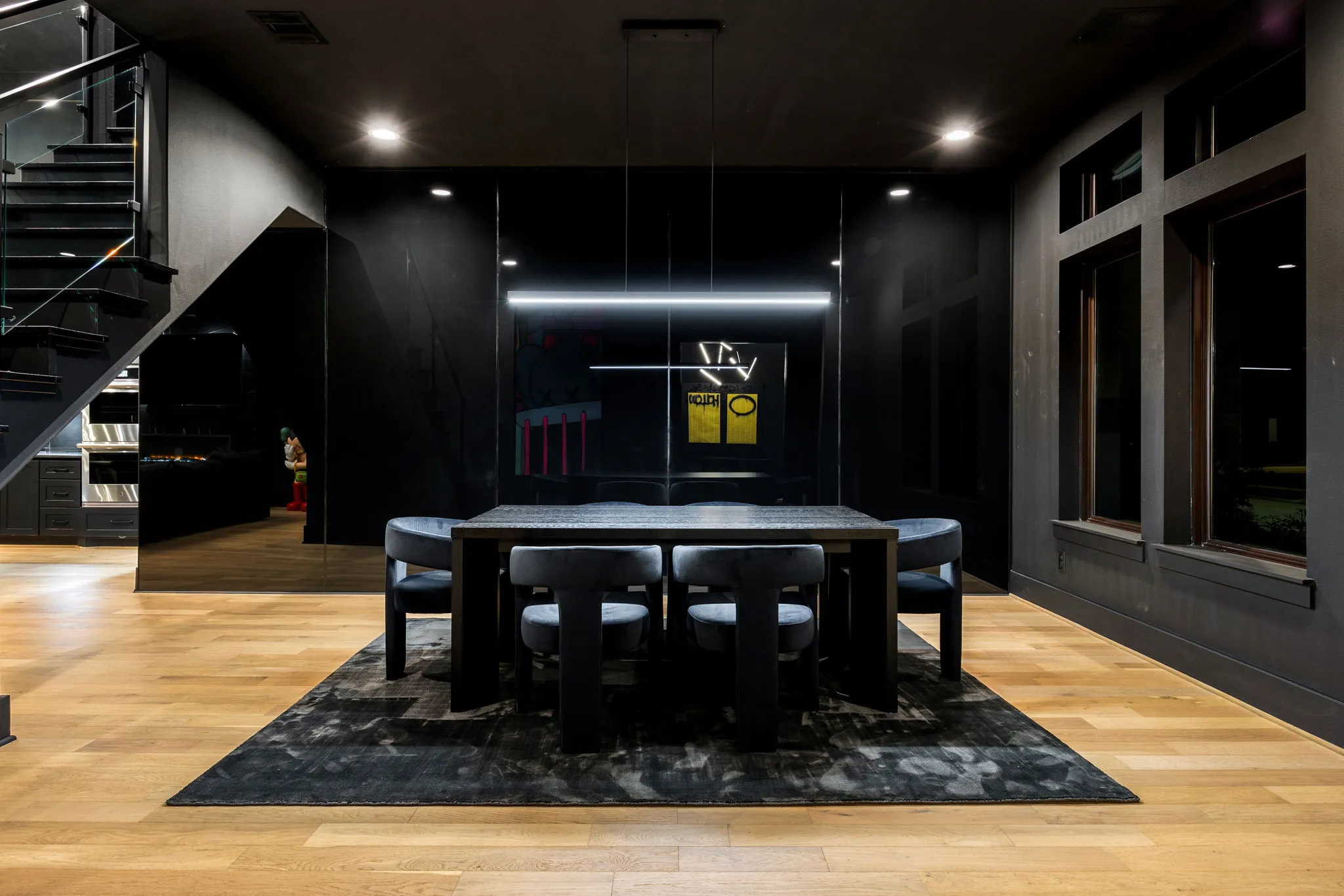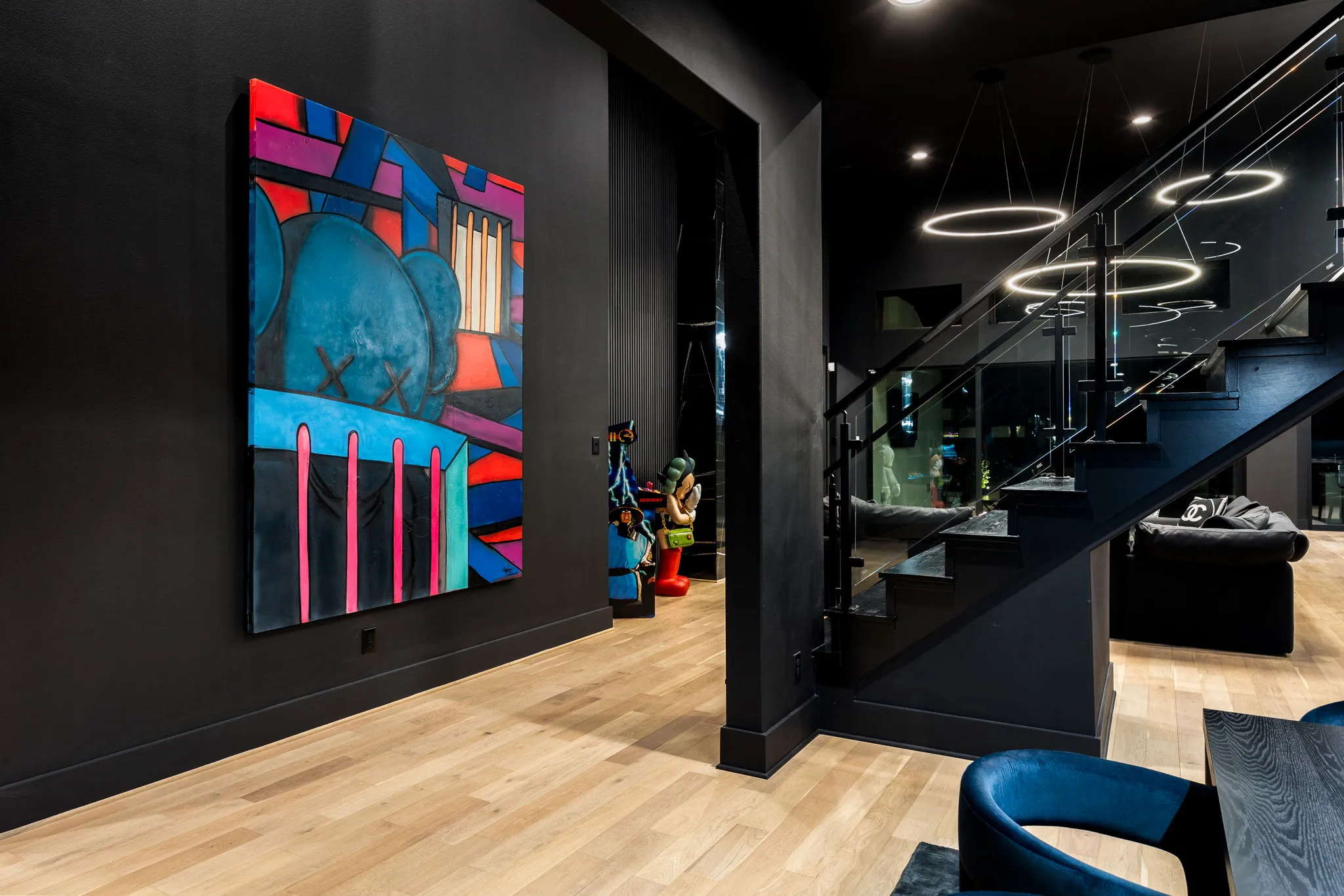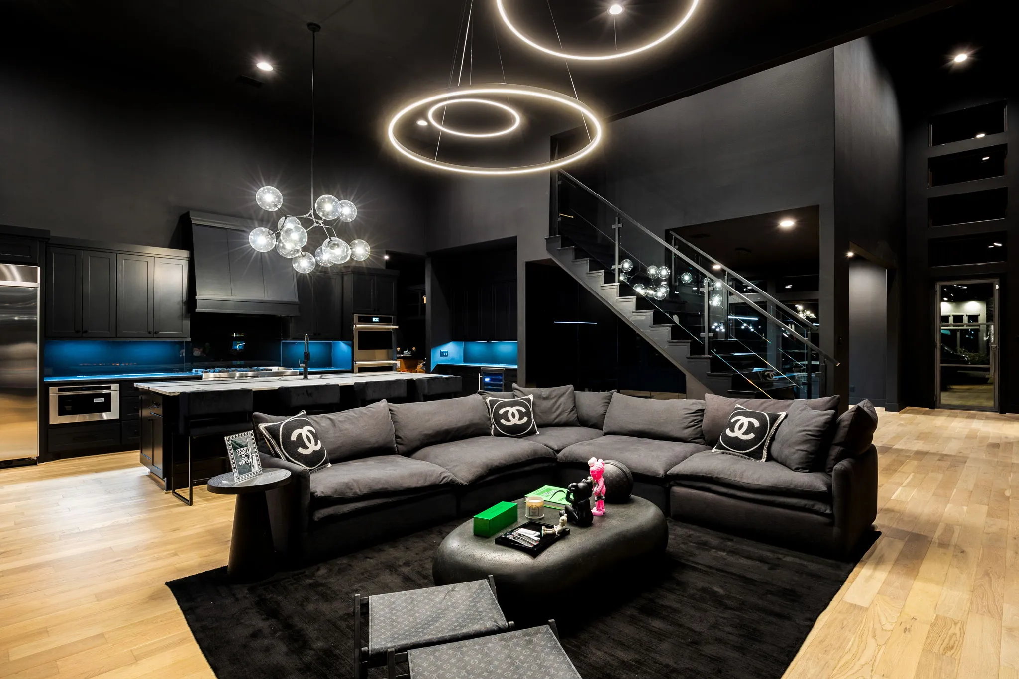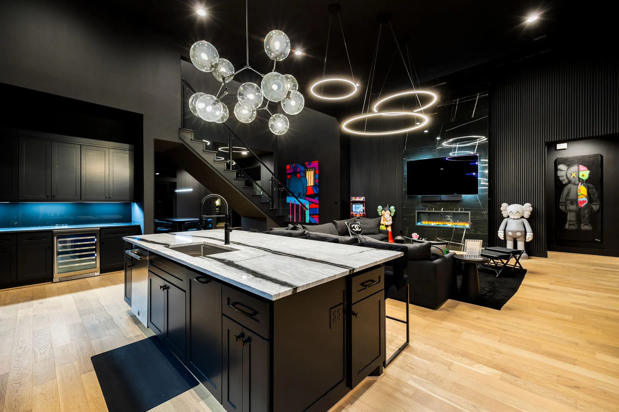 This innovative interior design project was crafted for a dynamic 21-year-old NFL client who envisioned a bold bachelor pad, centered around his favorite color: black. Embracing this unique vision, I transformed the space into an extraordinary home that stands out as a true masterpiece. Central to the design is a stunning glass staircase that adds a touch of elegance and openness, complemented by modern chandeliers that illuminate each area with a sophisticated glow. The walls are adorned with exquisite European artwork, enhancing the artistic ambiance of the space, while an Italian-made fireplace serves as a luxurious focal point. In the movie theater, a Rolls-Royce star ceiling creates a celestial experience, complete with custom LED panels that can adjust the mood for any occasion. This design beautifully blends elements of a playground with the sophistication of an art museum, resulting in an atmosphere that is both playful and visually striking. I am grateful for the opportunity to bring this concept to life, creating a space that reflects my client's youthful spirit and sets a new standard in modern living.