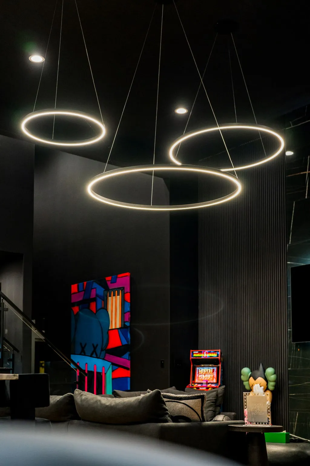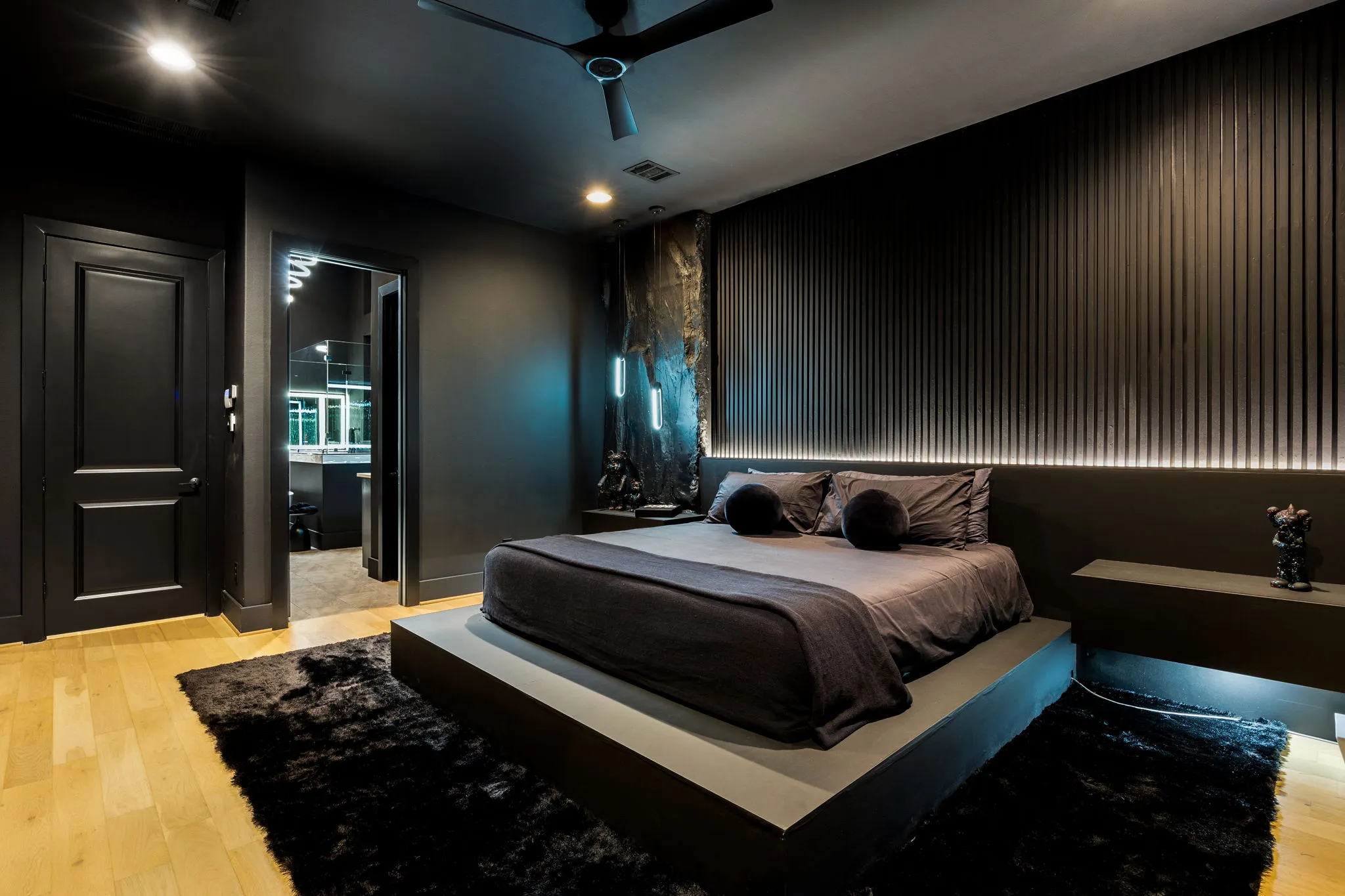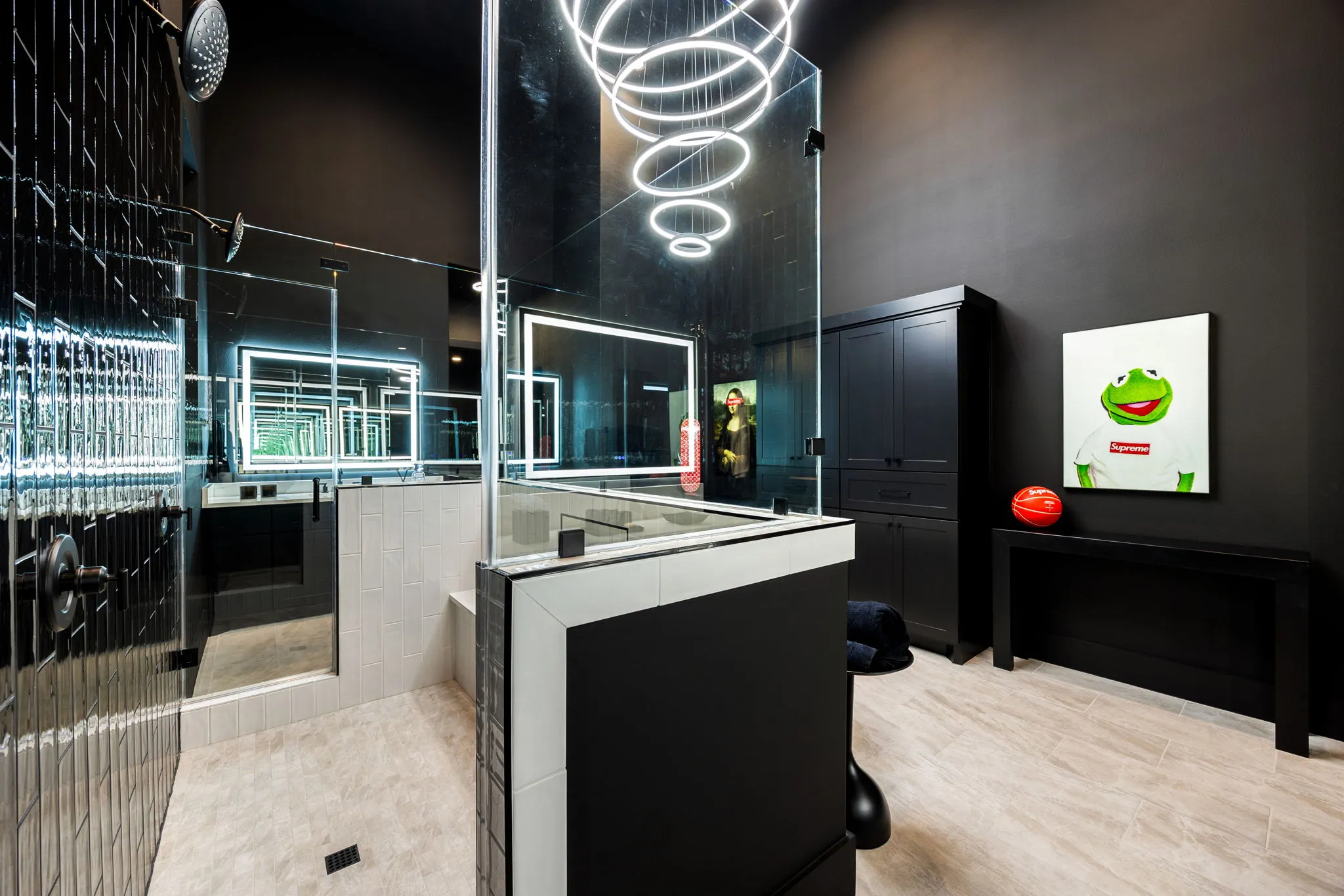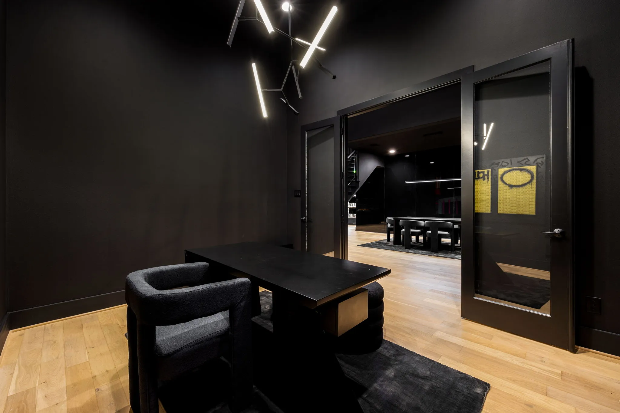 This innovative interior design project was crafted for a dynamic 21-year-old NFL client who envisioned a bold bachelor pad, centered around his favorite color: black. Embracing this unique vision, I transformed the space into an extraordinary home that stands out as a true masterpiece. Central to the design is a stunning glass staircase that adds a touch of elegance and openness, complemented by modern chandeliers that illuminate each area with a sophisticated glow. The walls are adorned with exquisite European artwork, enhancing the artistic ambiance of the space, while an Italian-made fireplace serves as a luxurious focal point. In the movie theater, a Rolls-Royce star ceiling creates a celestial experience, complete with custom LED panels that can adjust the mood for any occasion. This design beautifully blends elements of a playground with the sophistication of an art museum, resulting in an atmosphere that is both playful and visually striking. I am grateful for the opportunity to bring this concept to life, creating a space that reflects my client's youthful spirit and sets a new standard in modern living.