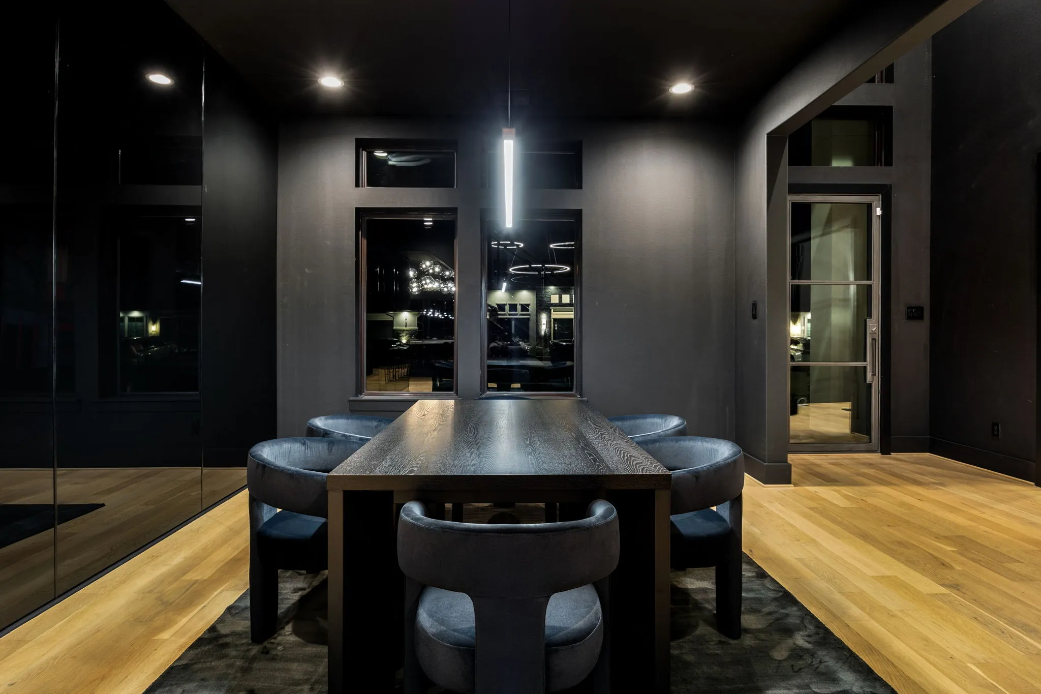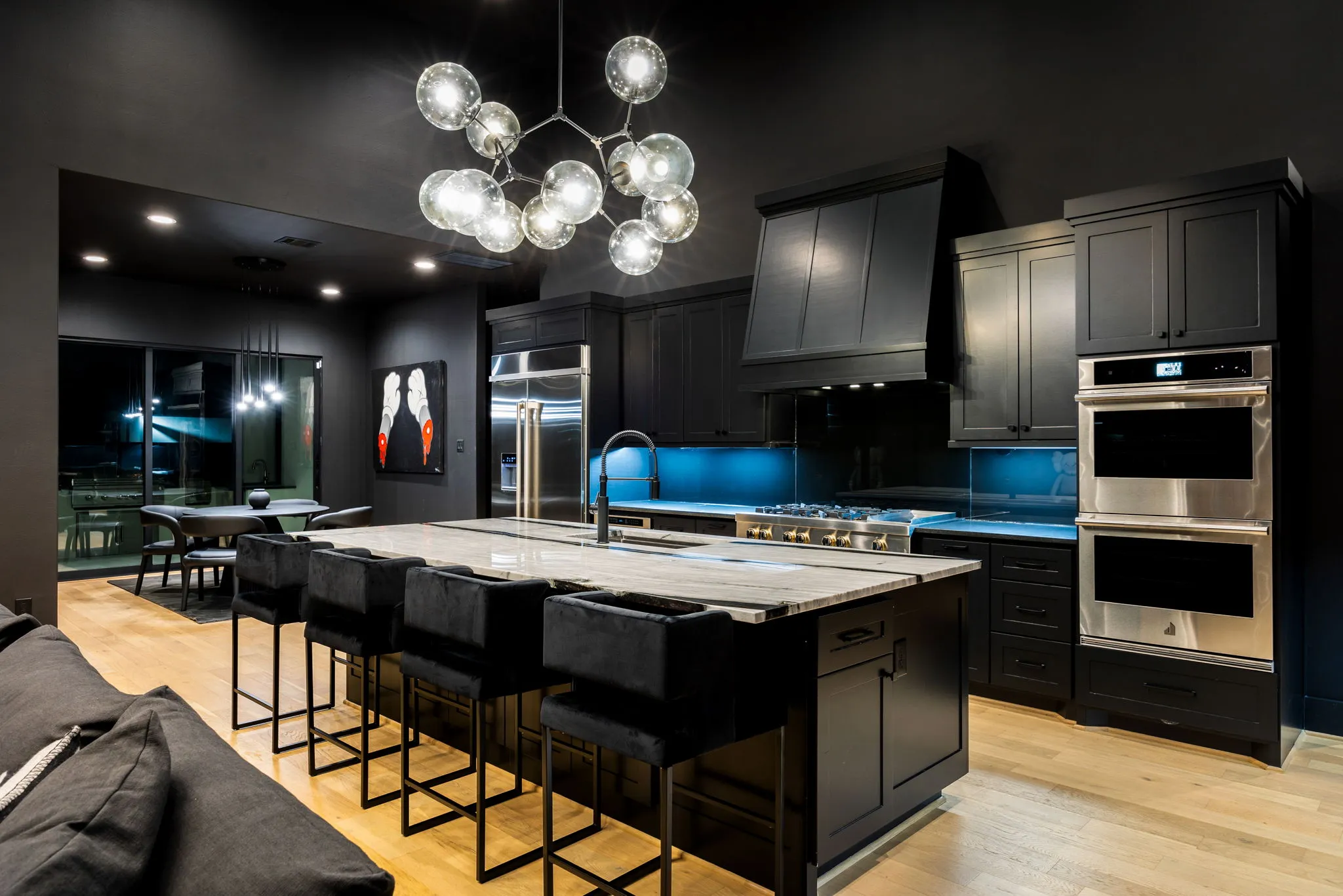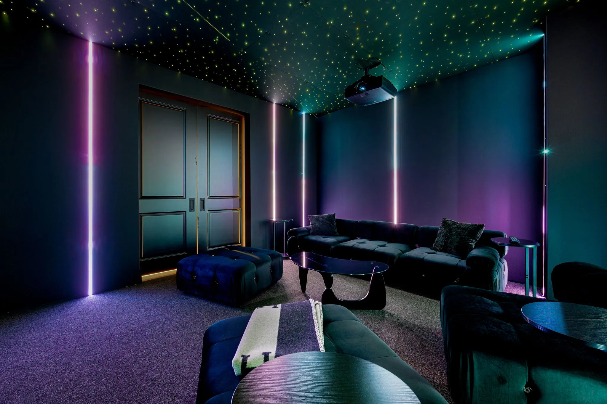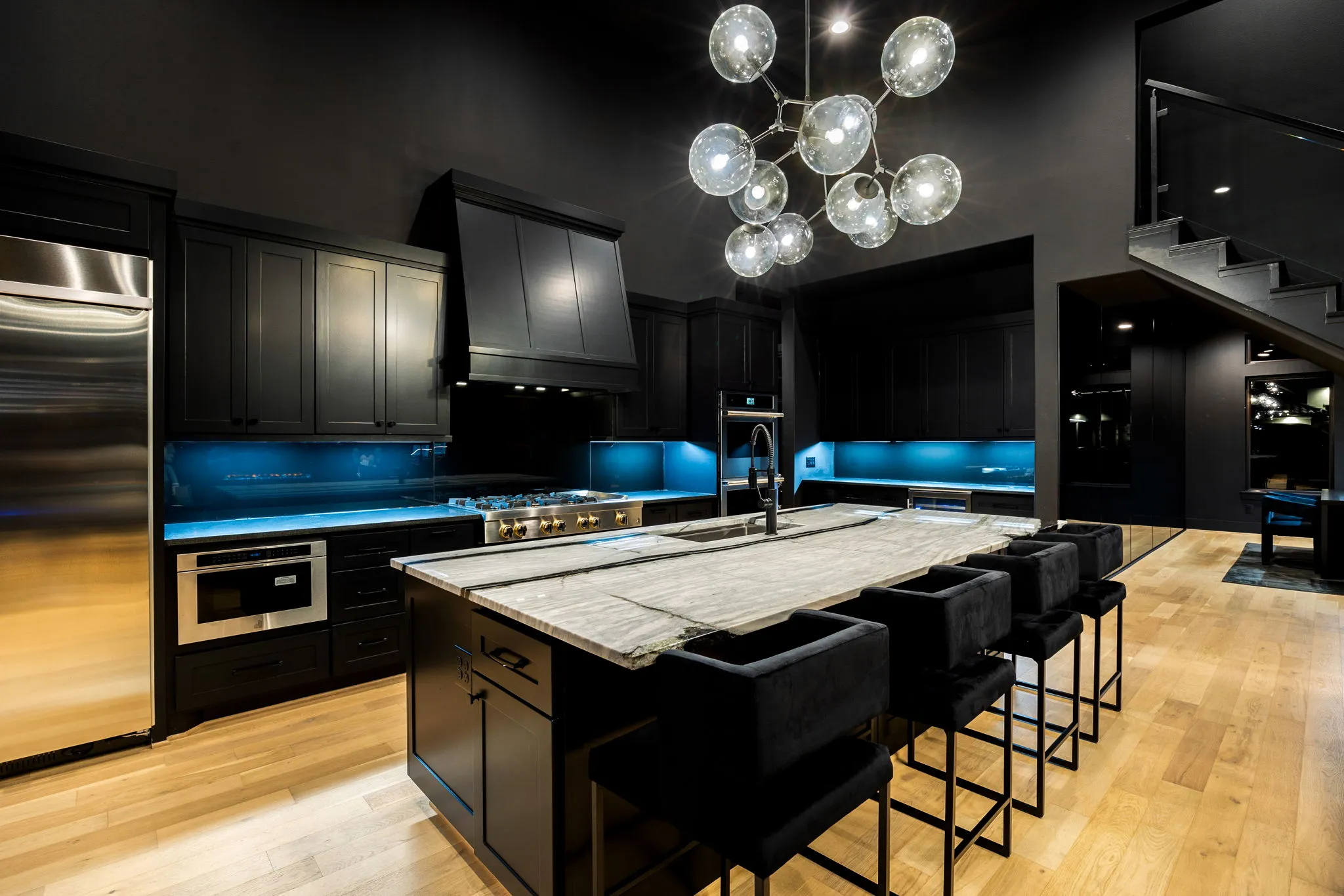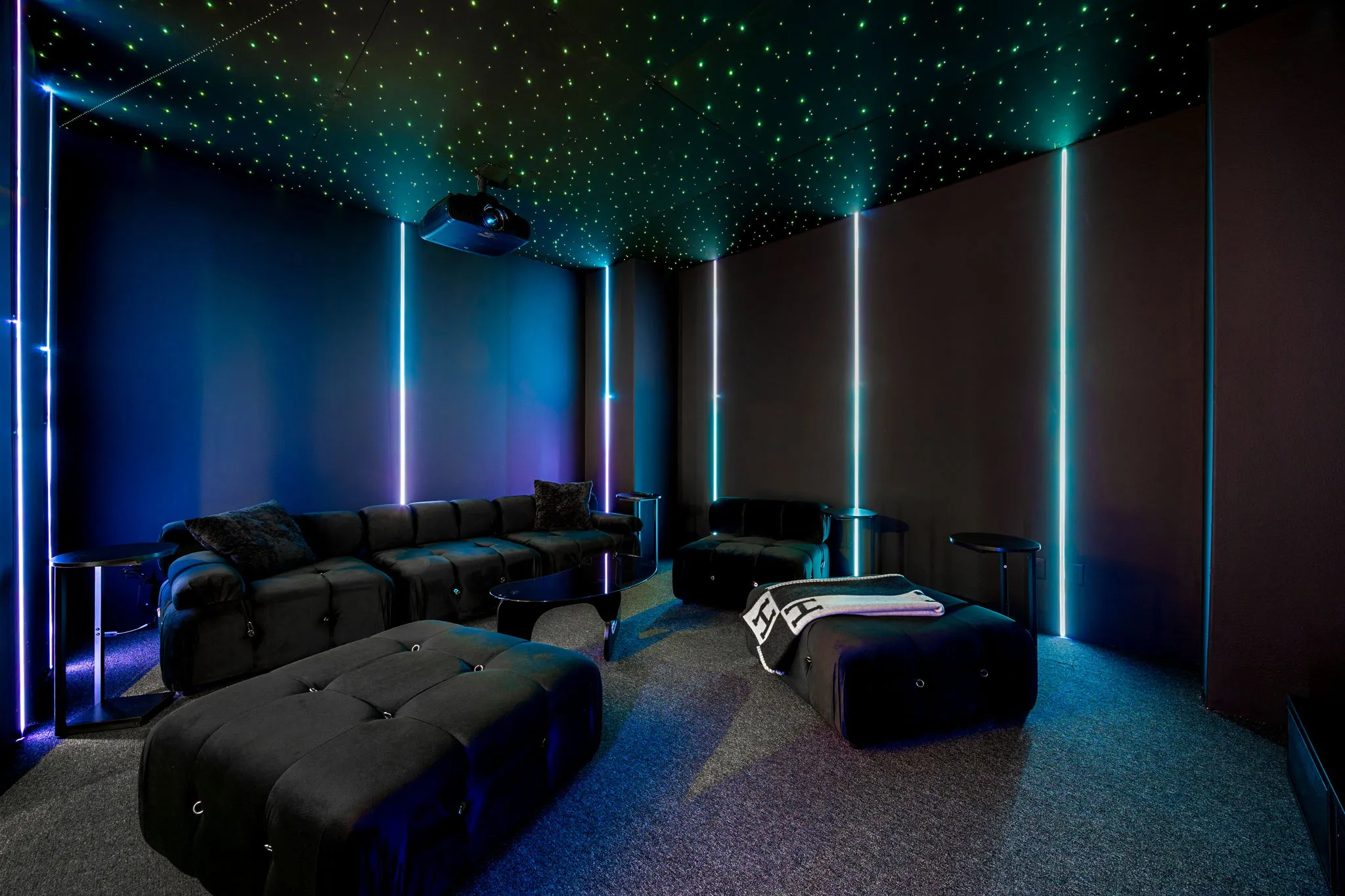 This innovative interior design project was crafted for a dynamic 21-year-old NFL client who envisioned a bold bachelor pad, centered around his favorite color: black. Embracing this unique vision, I transformed the space into an extraordinary home that stands out as a true masterpiece. Central to the design is a stunning glass staircase that adds a touch of elegance and openness, complemented by modern chandeliers that illuminate each area with a sophisticated glow. The walls are adorned with exquisite European artwork, enhancing the artistic ambiance of the space, while an Italian-made fireplace serves as a luxurious focal point. In the movie theater, a Rolls-Royce star ceiling creates a celestial experience, complete with custom LED panels that can adjust the mood for any occasion. This design beautifully blends elements of a playground with the sophistication of an art museum, resulting in an atmosphere that is both playful and visually striking. I am grateful for the opportunity to bring this concept to life, creating a space that reflects my client's youthful spirit and sets a new standard in modern living.